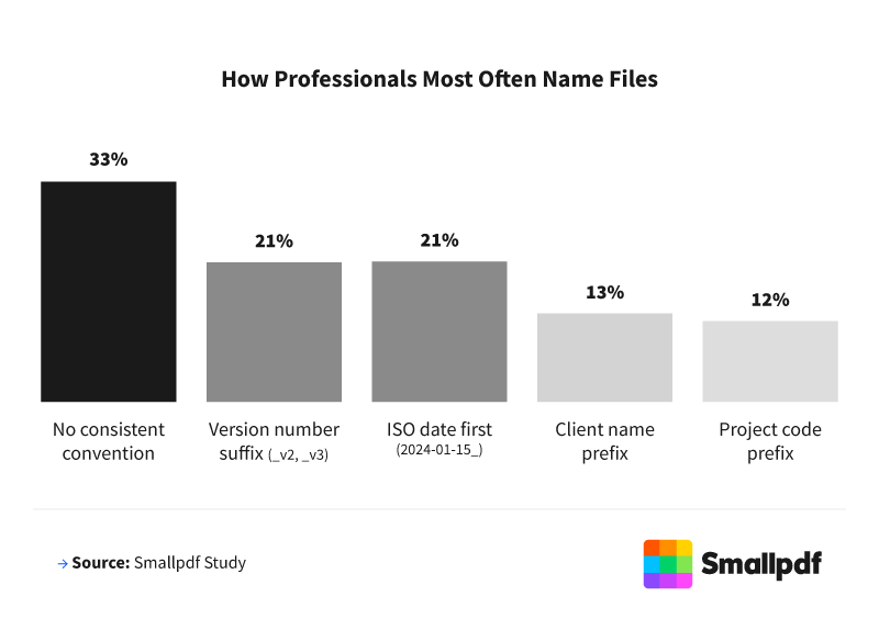 When asked how they most often name their files, 1 in 3 professionals (33%) say they have no consistent file naming convention.