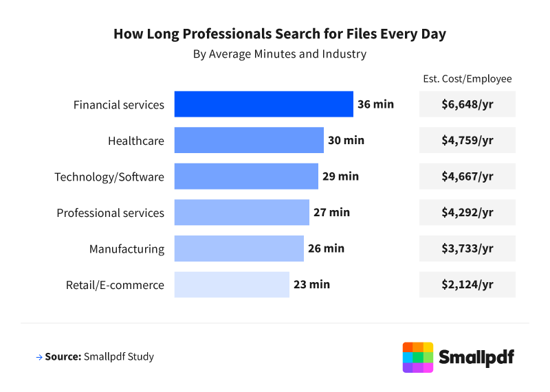 Financial services workers spend the most time per day searching for files (36 min), followed by healthcare (30 min) and technology (29 min).