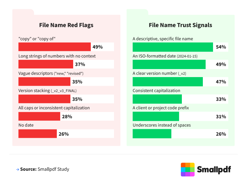 The top 3 file name red flags professionals look for are "copy" or "copy of" (49%), long strings of numbers with no context (37%), and vague descriptors (35%).