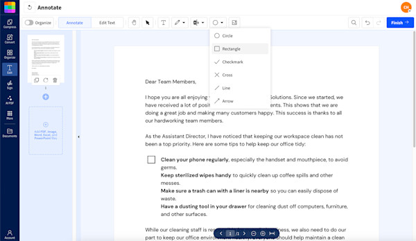 The PDF Annotator tool from Smallpdf is super convenient. It’s free, it’s online, and there’s no annoying sign-up process. You can use it on any device—phone, tablet, or computer. Here’s how to get started: 1. Upload your PDF into our PDF Annotator tool. 2. Go to the toolbar and select “Shape,” then pick “Rectangle.” 3. Draw your checkboxes wherever you need them on the PDF. 4. Hit “Finish” to save your edits. 5. Download your updated PDF with its new checkboxes!
