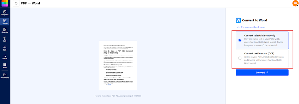- Select “Word (.docx),” then choose “Convert selectable text only.”