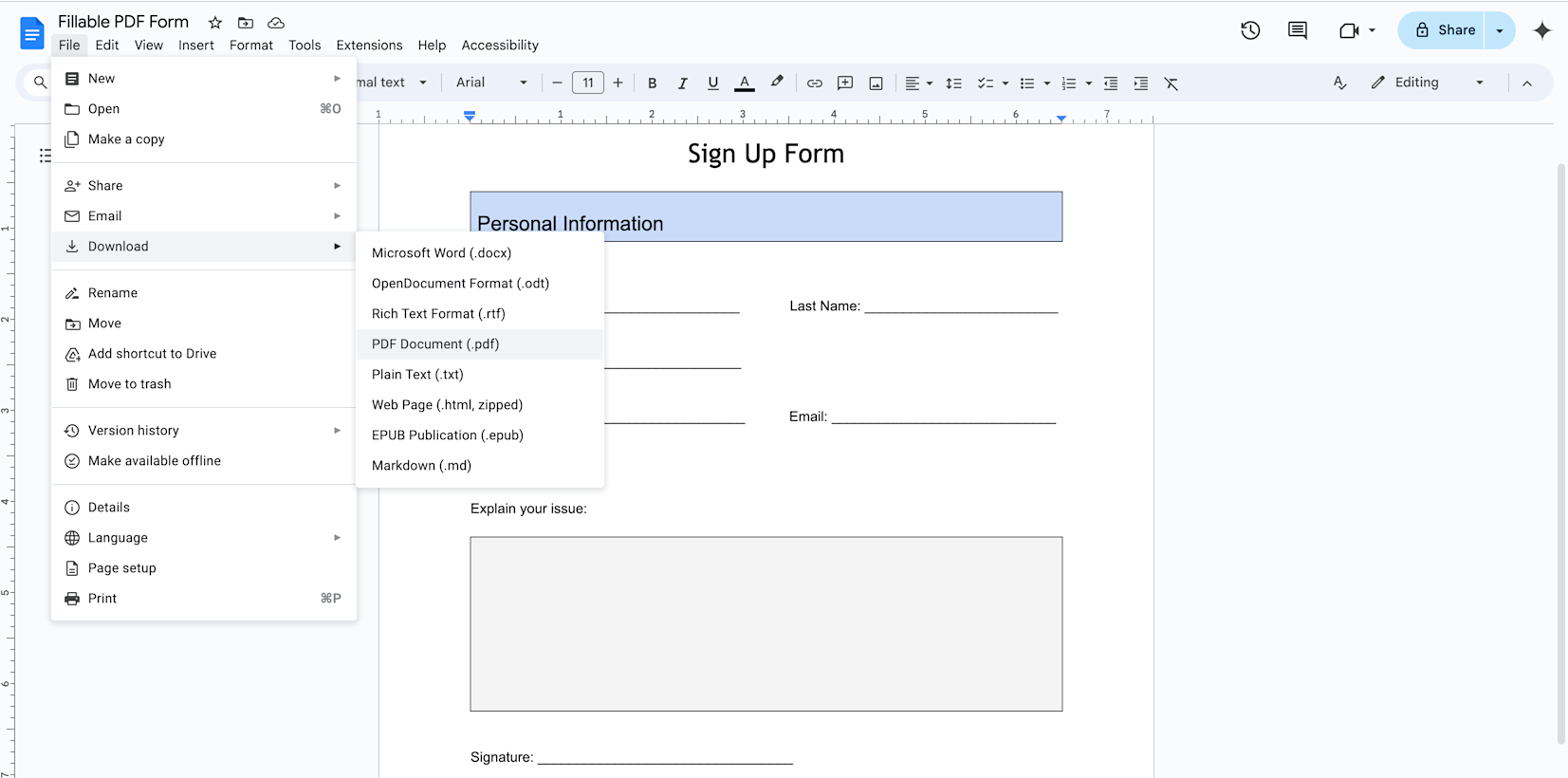 This combo works well if you prefer designing forms in Word or Docs but still want a fillable final PDF.