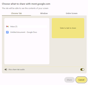 Choose to share Tab, Window, or Entire Screen