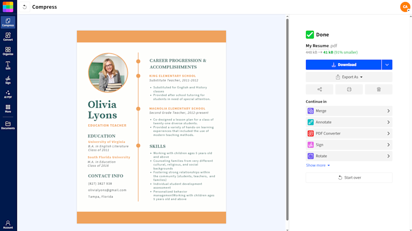 Make your resume easy to upload, share, and send by compressing your PDF without losing quality—perfect for job applications of all kinds!