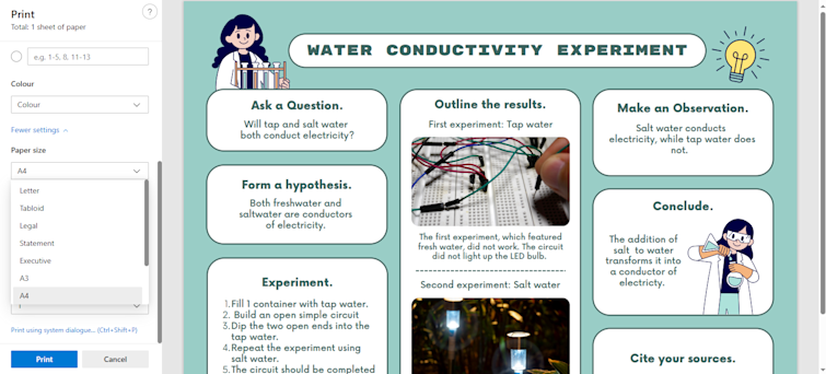 You can use your computer's built-in print settings to resize a PDF poster. On Windows, open the PDF and then the print dialog by clicking “Print” or pressing Ctrl + P. Select “Microsoft to PDF” as your printer and then adjust your paper size and layout before saving.