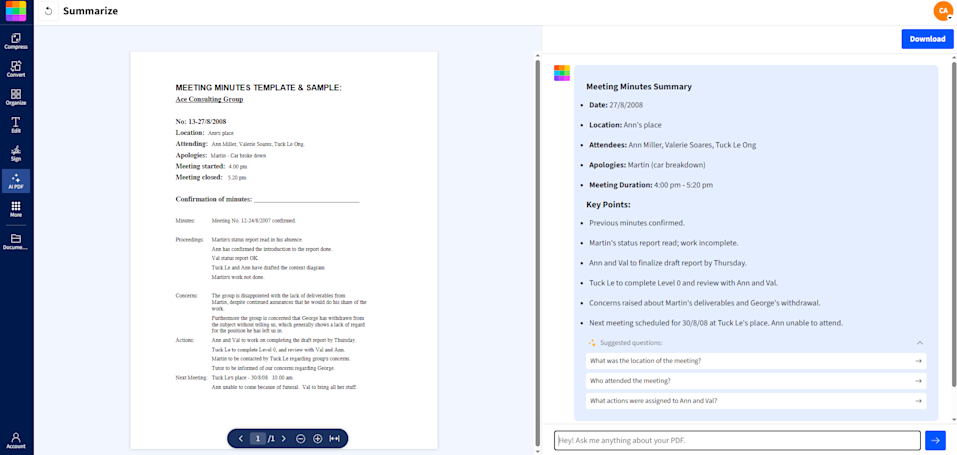 Now that your AI summary is ready, you can click the “Download” button in the top right-hand corner or chat with your PDF to ask further questions about your minutes.