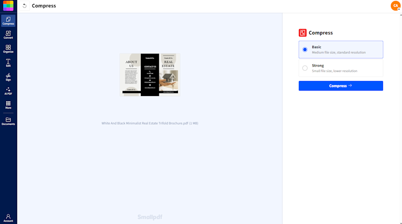 There’s a quick and easy way to compress your PDFs online without any additional software: use Smallpdf’s Compress PDF tool! Below are the steps to follow to compress your PDF:
