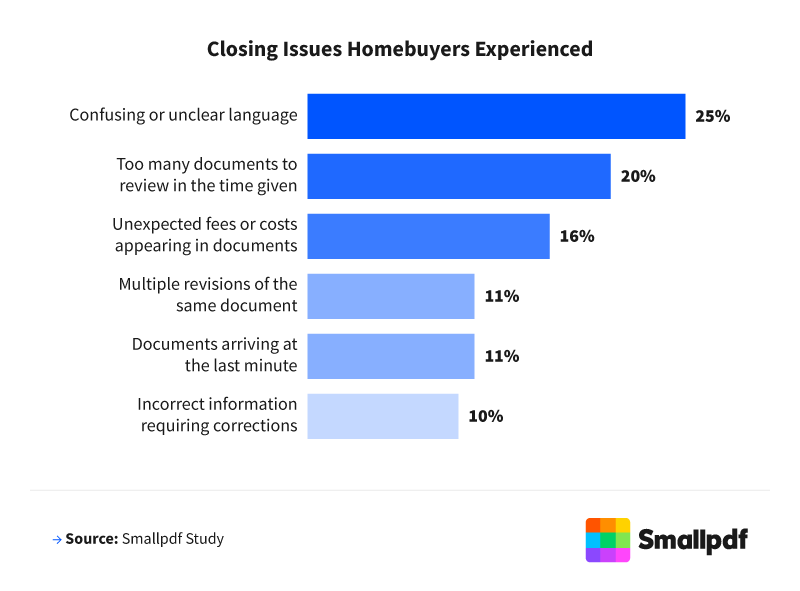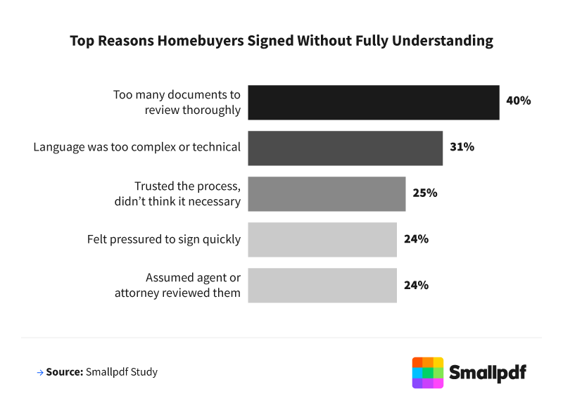 Homebuyers spent an average of 7 hours reviewing, signing, and managing closing documents, but they actually read only 61% of documents during closing. About a quarter of buyers (24%) said they signed without understanding because they assumed their agent or attorney had already reviewed everything.