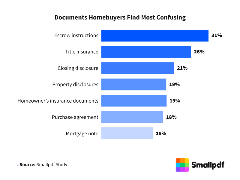 Nearly half of homebuyers (45%) admitted they signed closing documents they didn't fully understand, and 24% felt pressured to sign quickly. Escrow instructions stood out as the most confusing document in the closing packet, followed by title insurance.