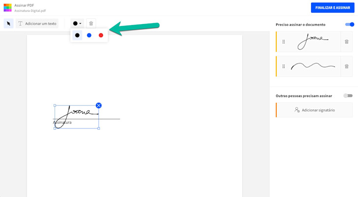 Se não quiser que a assinatura seja na cor padrão preta, você também pode escolher entre azul (marinho) e vermelho. Depois de colocar a assinatura no documento, selecione a assinatura e veja que há um ponto preto na parte inferior. Ao clicar no ponto, você poderá alterar a cor para vermelho ou azul.